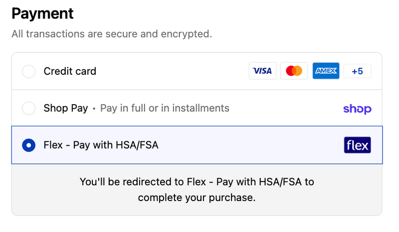 Select Flex Pay with HSA/FSA at checkout. You may be asked to complete a brief telehealth consult to confirm eligibility. Once approved, you can enter your HSA or FSA debit card and complete your purchase. If you do not have your HSA or FSA card available, you can use a regular credit or debit card and submit your receipt and Letter of Medical Necessity for reimbursement.