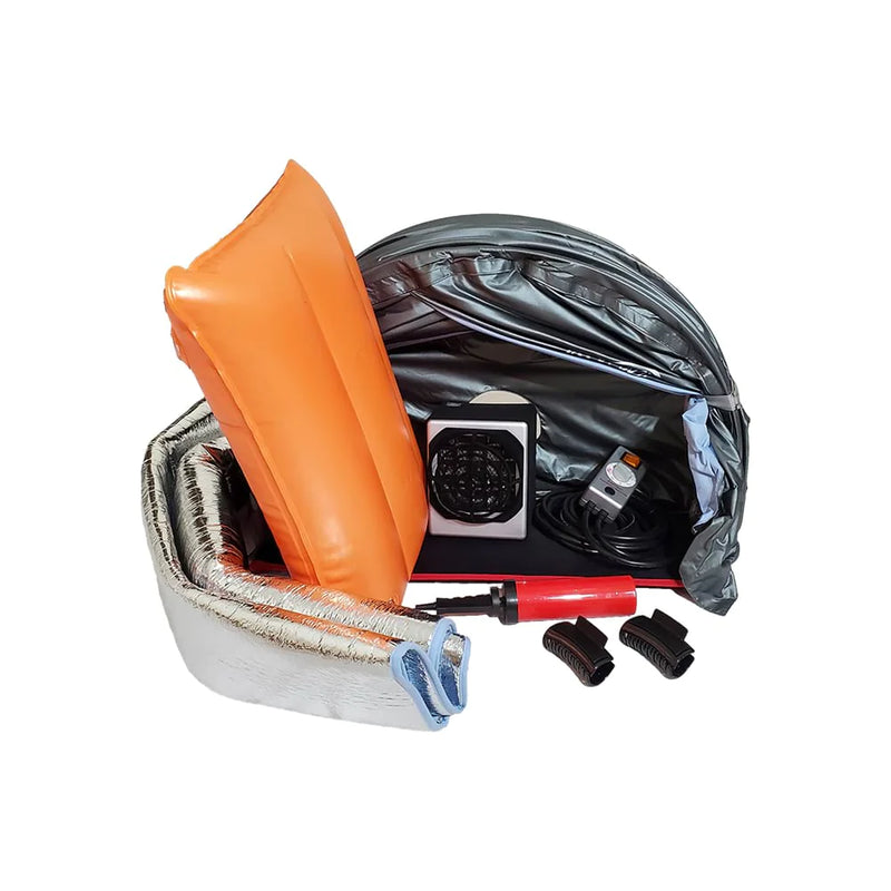 - Parts Included: Retractable Reflective Sauna Tent, Mat, Far Infrared Radiator, Orange Inflatable Headrest, Manual Air Pump, Controller, Carry Bag